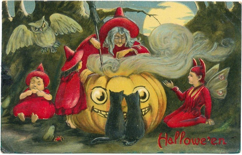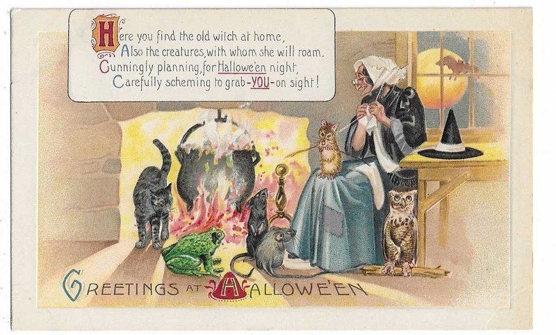 | Halloween Postcard Witch Cat Frog Owl rodents arond fireplace | Auction | $939 |
