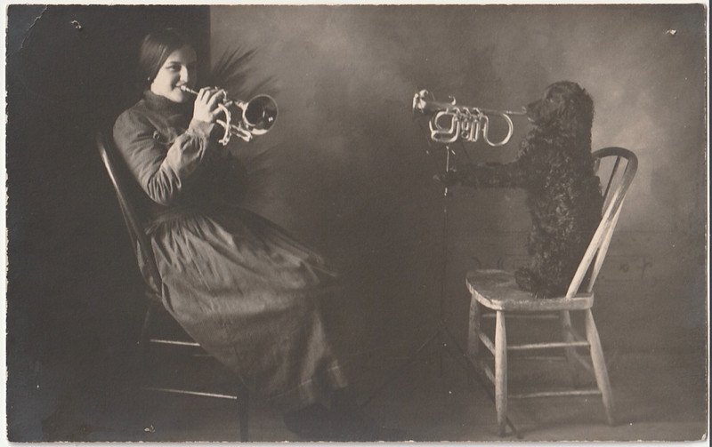| 1910 GIRL & COCKER SPANIEL DOG PLAYING TRUMPETS PHOTO POSTCARD RPPC UNUSUAL | Auction | $226 |